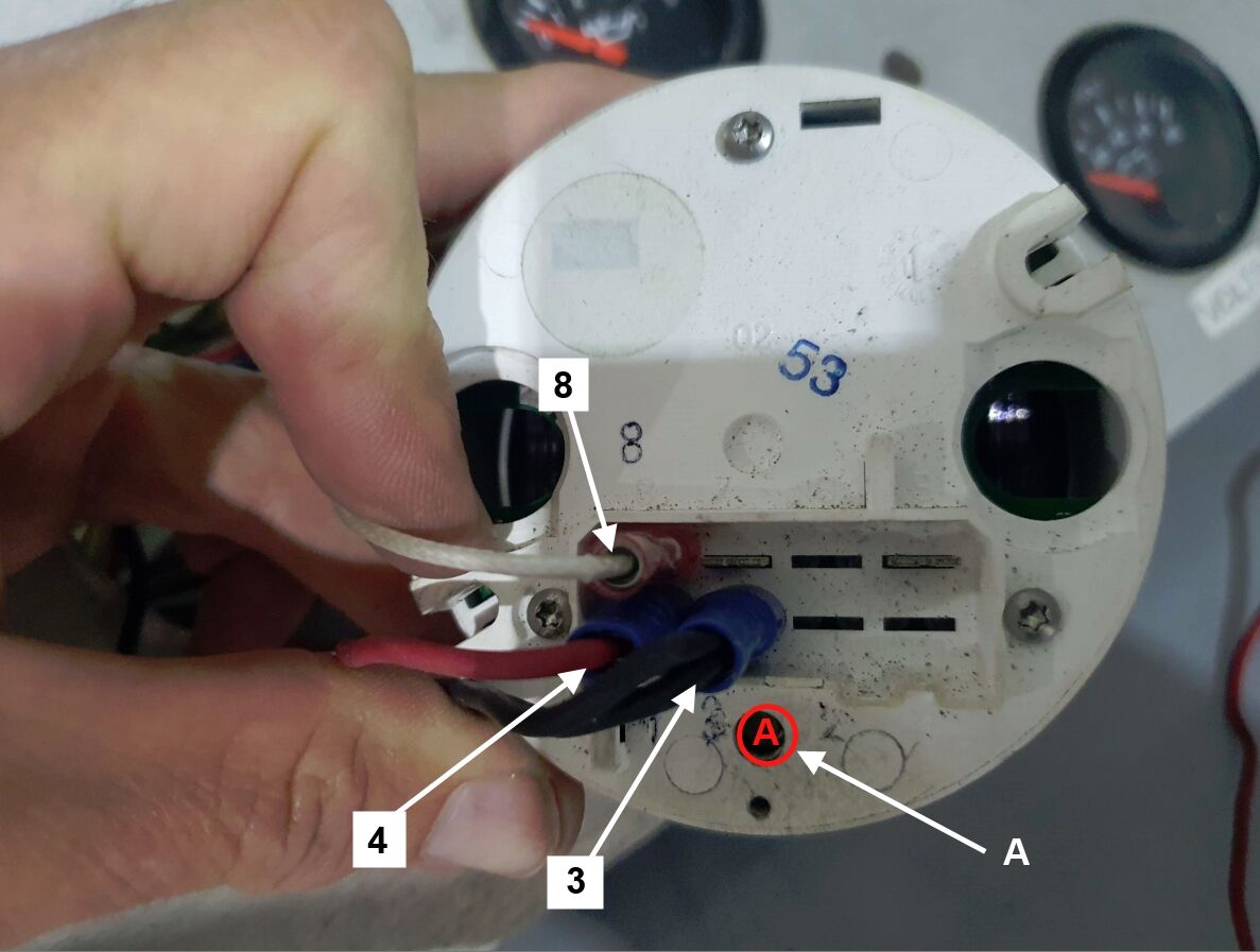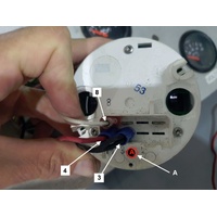 - Using a match stick or similar tool, press and hold the button marked “A” (see figure) while powering up the tachometer.